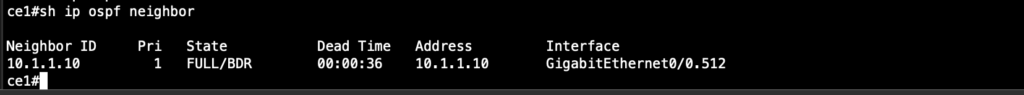 OSPF has been configured on the CE devices. As root, CE1 will be neighbours with both CE2 & CE3