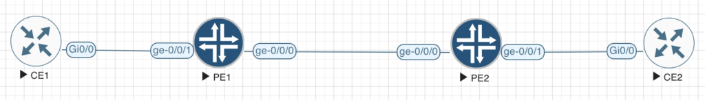 Again we will use vjunos router for this lab. Aim of the lab is to direct traffic for the VPWS circuit over a certain path. Traffic from PE1 will go via PE4 and traffic from PE3 will go via PE2.