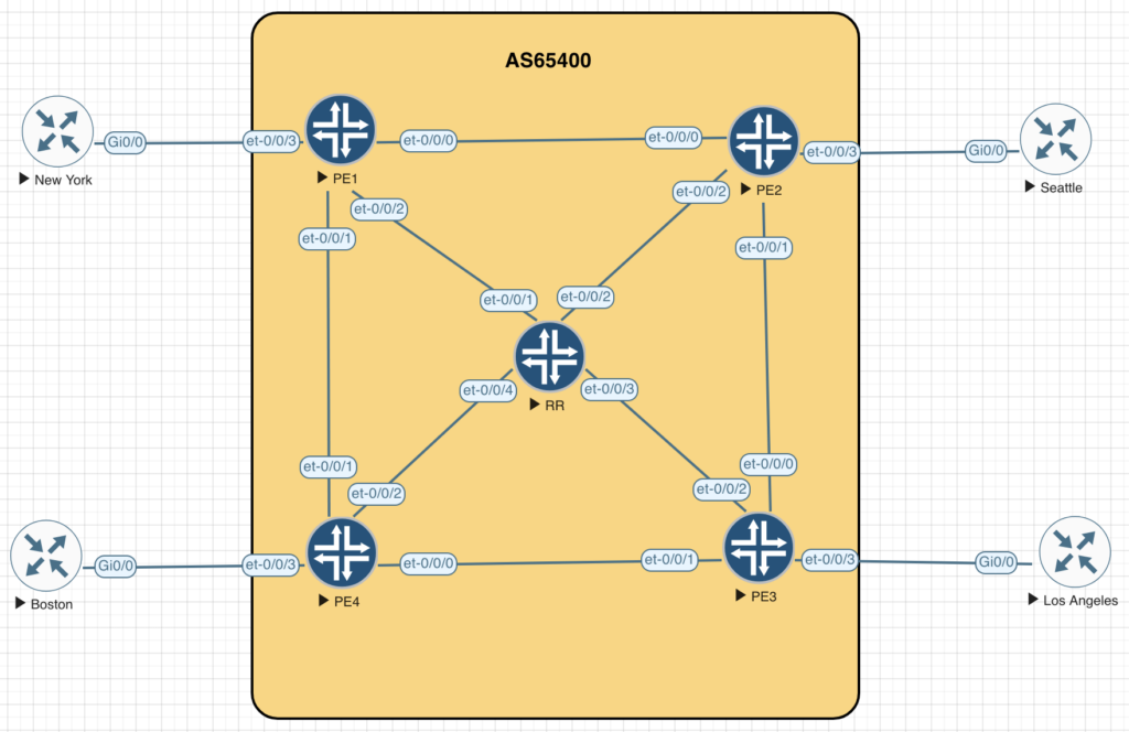 The lab is EVPN E-Tree on Junos Evolved. New York is the Head Office (root) and the other sites are satellites (leaves).