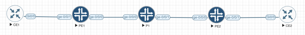 Again we will use vjunos router for this lab. Aim of the lab is to direct traffic for the VPWS circuit over a certain path. Traffic from PE1 will go via PE4 and traffic from PE3 will go via PE2.